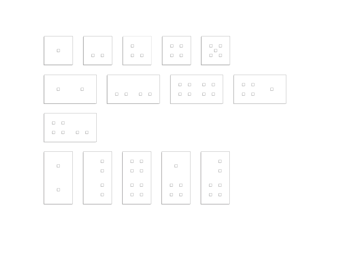 5 tailles de façades : simple 85 x 85 mm, double 85 x 156 mm, triple 85 x 227 mm, quadruple 85 x 298 mm, quintuple 85 x 369 mm. Utilisables verticalement ou horizontalement.